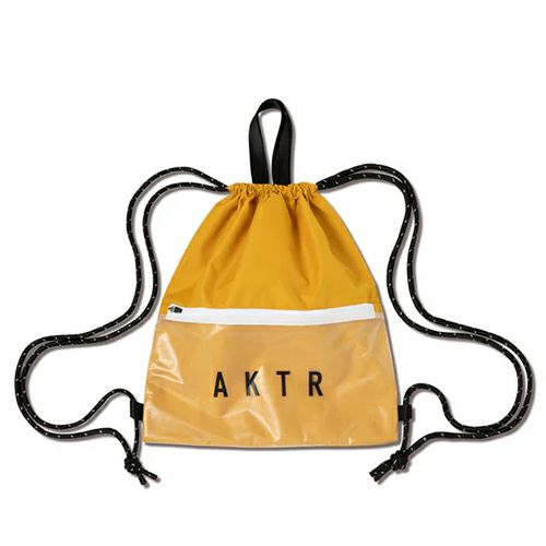 強度のあるポリエステル素材を使用したナップサック。フロントにファスナーで開閉可能なPVC素材のポケットをつけることにより、そこに収納したものが水に濡れるのを防ぐという機能付き。サブバッグとしてもメインバッグとしても使用できる、使い勝手の良いアイテム。