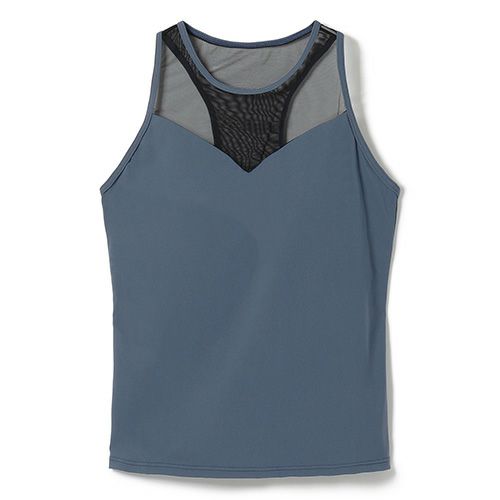 胸元のシアー生地がアクセントに、背中は肩甲骨に生地がかからず動きやすいパターン。