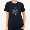 胸のプリントは羽を組み合わせた上品なグラフィックがポイントの半袖Tシャツ。女性らしいやわらかい風合いが特徴のサンスクリーンハイゲージニット。日傘のように太陽の光をブロックするサンスクリーンを採用し、ジリジリした“熱さ”の原因である近赤外線をカット。
