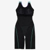 露出を抑えた小さな背穴。肩ストラップは食い込みを軽減するために幅広仕様です。着脱時のもたつきが少なくズレにくく動きやすい、縫い込み式のカップ付き。クロッチ部分には肌あたりのよい柔らかな素材を使用しています。膝上までの4分丈です。ゆったりとしたフィット感で、着脱時もトレーニング時も快適性が持続します。股下のハギをなくし、スムーズな脚の動きを実現しました。安心感のある厚みがボディラインをほどよくカバーします。はっ水機能付き(非フッ素はっ水)。