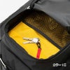 メインへのアクセスには、大きく開閉するU字型ファスナーを採用し、両サイドに荷物の仕分けに便利な大型の収納スペースを設けています。