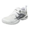 ◆パワークッション プラス 衝撃吸収性と反発性を併せ持つ衝撃吸収反発素材「パワークッション」がさらに進化。素材や形状の研究を重ね、従来の軽量性を維持しながら、衝撃吸収性28%アップ・反発性62%アップ(一般的な衝撃吸収材[EVA]との比較)を実現し、12mの高さから落とした生卵が、割れずに6m以上跳ね返る(※ヨネックス(株)調べ)新衝撃吸収反発素材。 ◆BOA?フィットシステム BOA?フィットシステムは、最も過酷な状況下でもパフォーマンスを発揮するよう設計された微調節可能な精密フィットを提供します。微調節可能なダイヤル、強靭で軽量なレース、低摩擦のレースガイドという三つの不可欠な要素で構成され、精密なフィットを可能とします。 ◆ラウンドソール? R7 アウトソール外周全体に3種類の丸み(10/7/5)を持たせ、自然な着地と蹴り出しが可能。※数字が大きいほど、ソール外側の丸みが大きく、安定性重視。特許第4958505号 ◆フェザーバウンスフォーム 軽量素材ハイパーフェザーライトをベースに反発性を 約20%向上させた※軽くて弾む新素材。※ヨネックス調べ ◆トウアシストシェイプ 親指の圧迫感を解消したつま先設計とし、かつ、中足部とかかと部のサポート性を高めることで、シューズ内の足のズレを抑え、パワーロスのない素早いフットワークを実現。 ◆デュラブルスキンライト ゴムのような弾力性と硬質プラスチックのような強靭さを併せ持つP.U.素材。フィット性と軽量性を向上 ◆素材 アッパー:合成繊維+合成樹脂 ミッドソール:合成樹脂 アウトソール:ゴム底 ◆原産地:ベトナム